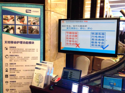 展會(huì)期間我公司接待了觀展及參展人員數(shù)百人,眾多人員關(guān)切詢問我公司產(chǎn)品,本次展會(huì)我公司展出了天坦移動(dòng)護(hù)理系統(tǒng),天坦移動(dòng)查房系統(tǒng),及醫(yī)療大數(shù)據(jù)分析平臺(tái),通過現(xiàn)場(chǎng)演示受到了眾多專業(yè)人士和媒體的高度關(guān)注,尤其是天坦移動(dòng)護(hù)理系統(tǒng)吸引了眾多觀眾的眼球。